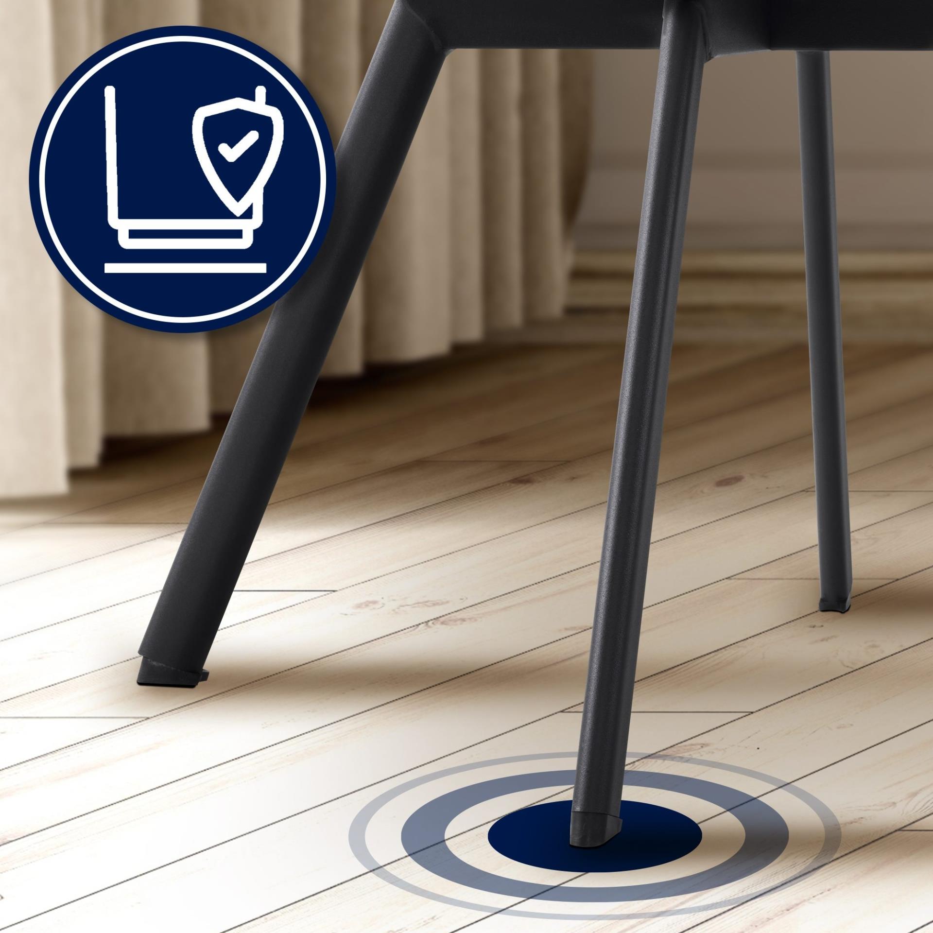 Der Sitz ist jeweils 90º nach rechts und links drehbar und ruht auf einem soliden Metallgestell mit vier Beinen, das Ihnen einen stabilen und bis zu 150 kg belastbaren Stuhl garantiert. Die Beine sind außerdem mit rutschfesten Füßen ausgestattet, die auch den Boden schützen.