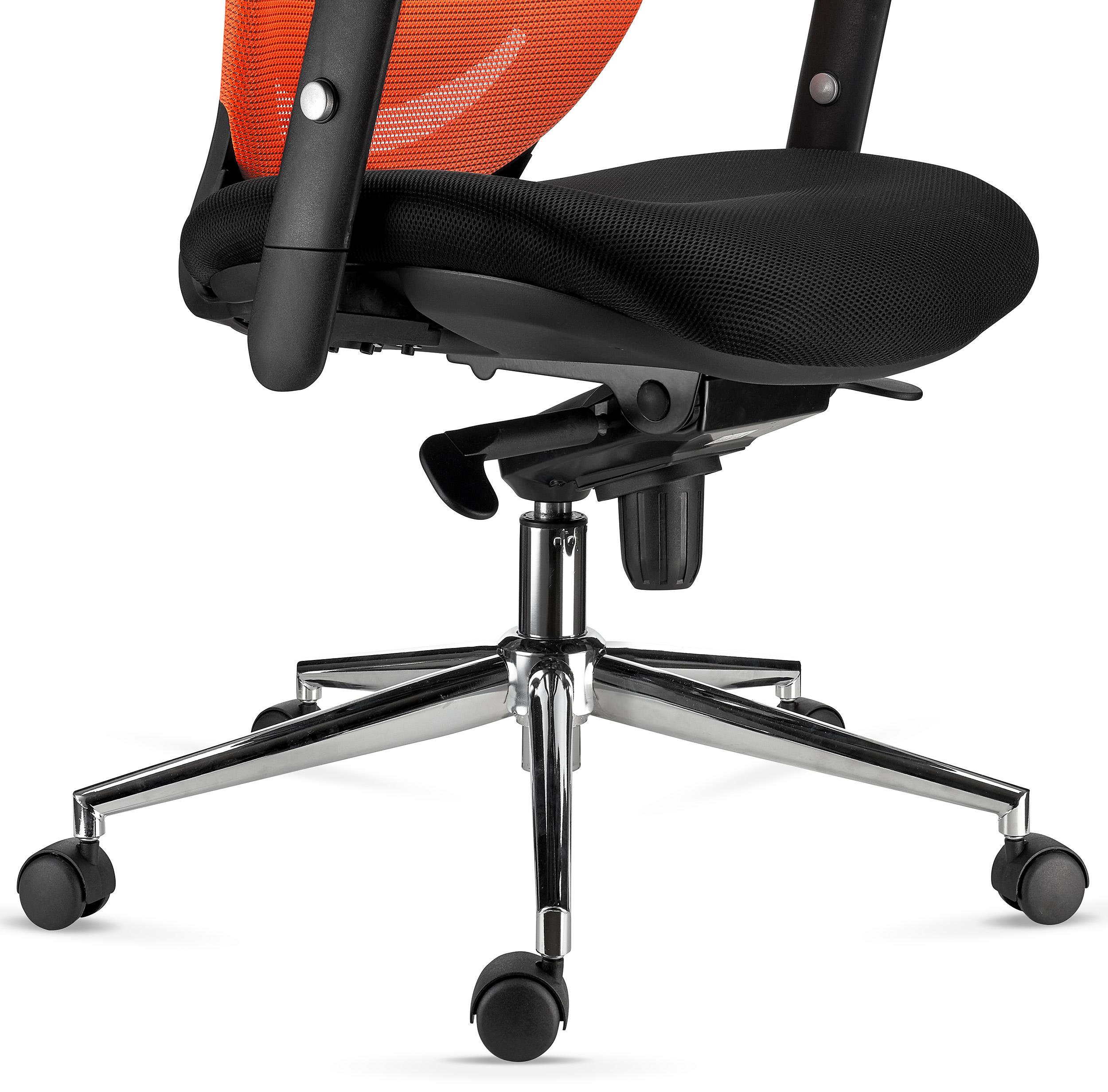 Einer der wichtigsten Aspekte dieses Stuhls ist seine ergonomisch gestaltene Rückenlehne aus atmungsaktivem Netzbezug und mit gepolsterter Lordosenstütze, die sowohl in der Höhe als auch in der Tiefe verstellt werden kann. Dieses Merkmal ist aus ergonomischer Sicht besonders wichtig, da damit der Rücken optimal gestützt und die Körperhaltung langfristig unterstützt wird.