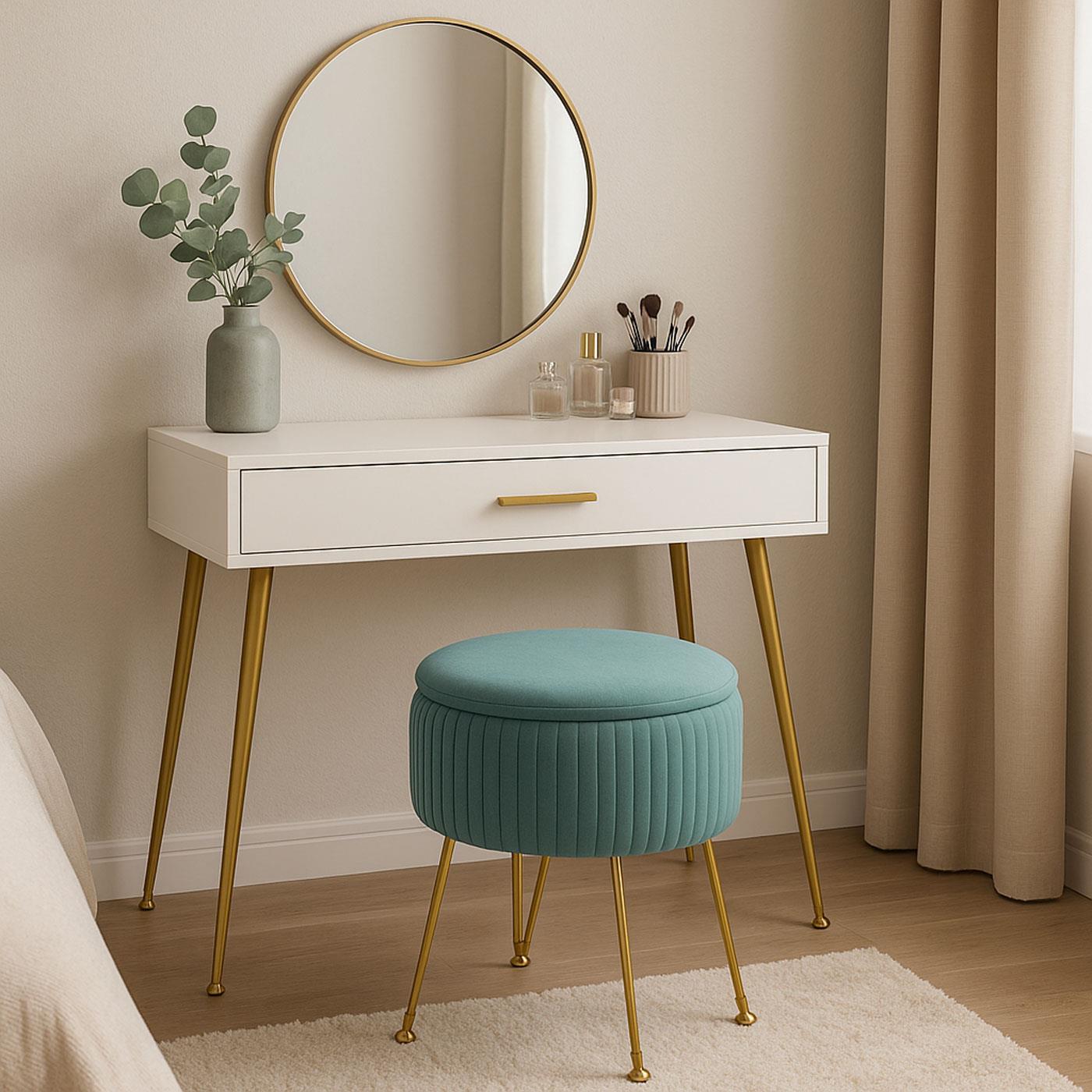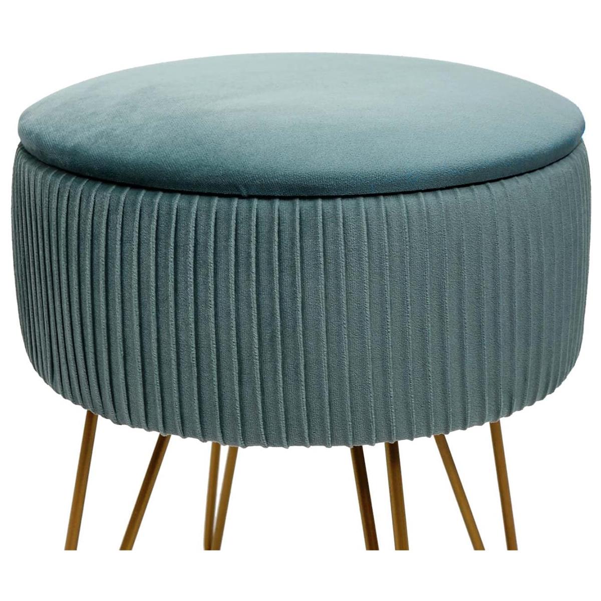Der Hocker ist mit einem weichen und strapazierfähigen, samtähnlichen Stoff bezogen, der ihm dank der Ziernähte einen raffinierten Look verleiht. Es handelt sich um ein Produkt, das sicherlich nicht unbemerkt bleibt. Das Gestell ist aus massivem Metall gefertigt und garantiert nicht nur einen eleganten Touch, sondern auch eine hervorragende Stabilität. Die Füße sind außerdem verstellbar, sodass dieser Hocker auch auf unebenen Oberflächen aufgestellt werden kann.