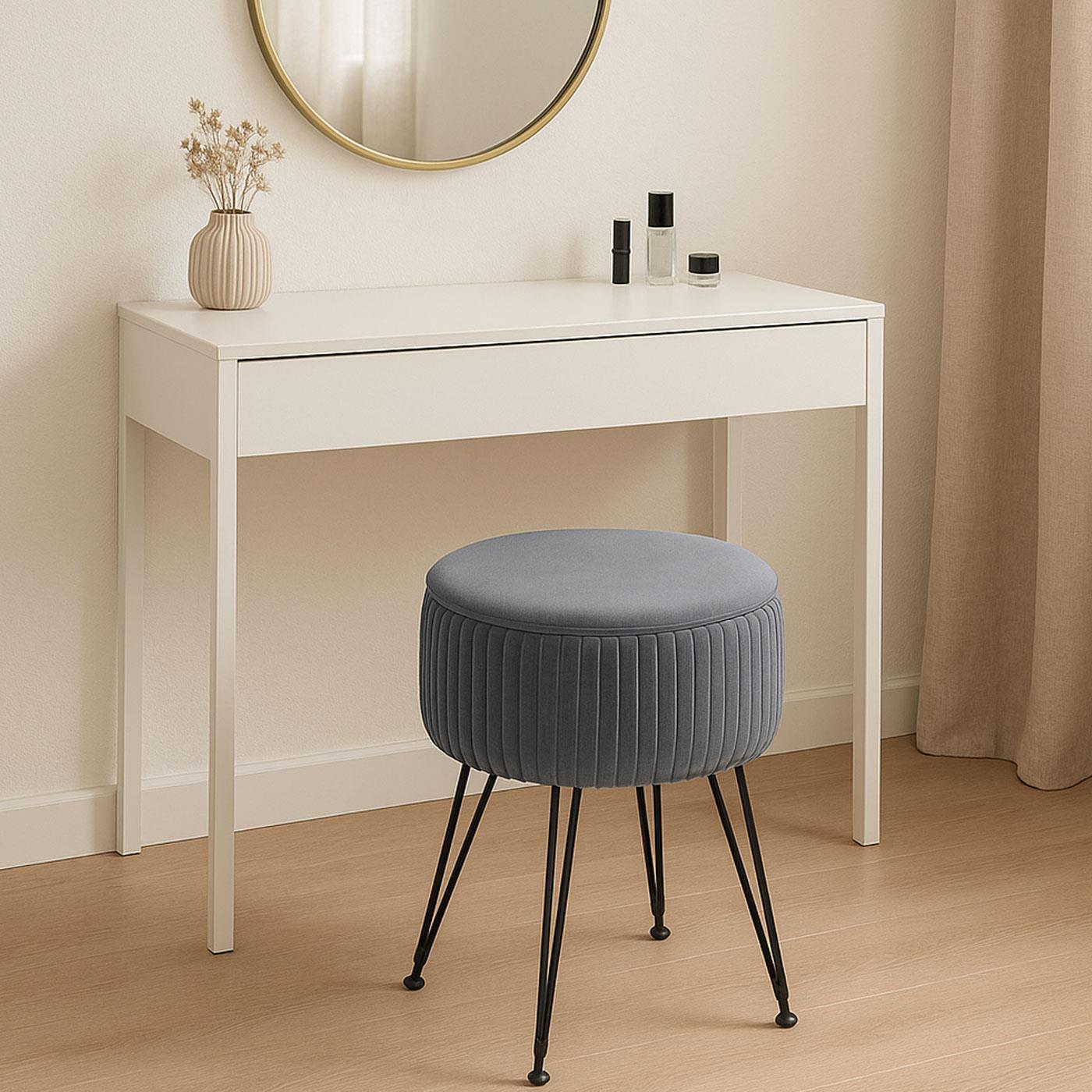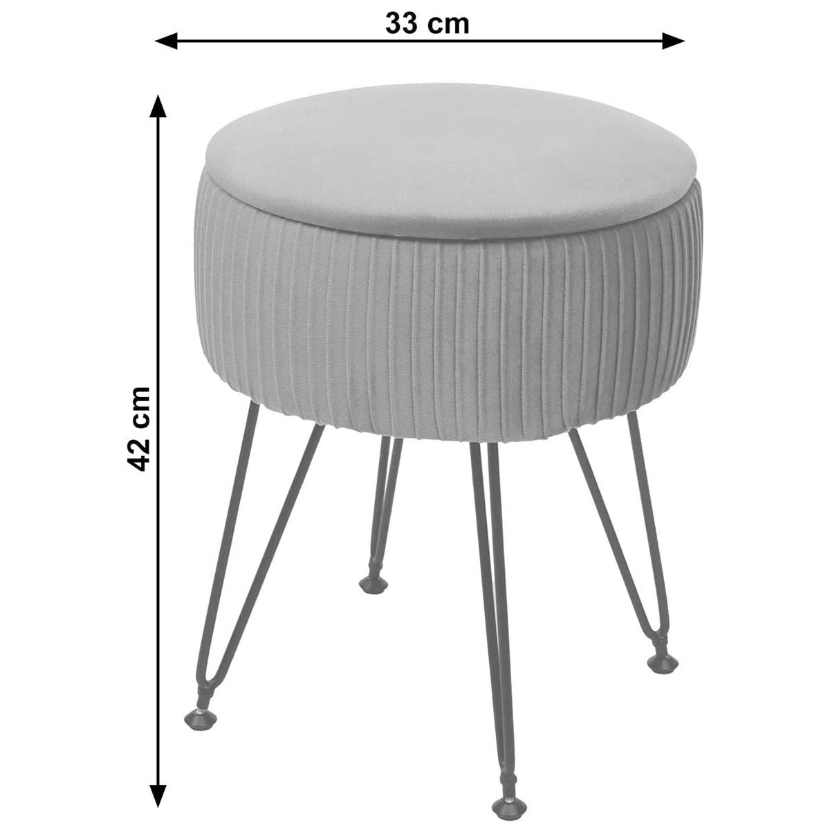 Der Hocker ist mit einem weichen und strapazierfähigen, samtähnlichen Stoff bezogen, der ihm dank der Ziernähte einen raffinierten Look verleiht. Es handelt sich um ein Produkt, das sicherlich nicht unbemerkt bleibt. Das Gestell ist aus massivem Metall gefertigt und garantiert nicht nur einen eleganten Touch, sondern auch eine hervorragende Stabilität. Die Füße sind außerdem verstellbar, sodass dieser Hocker auch auf unebenen Oberflächen aufgestellt werden kann.