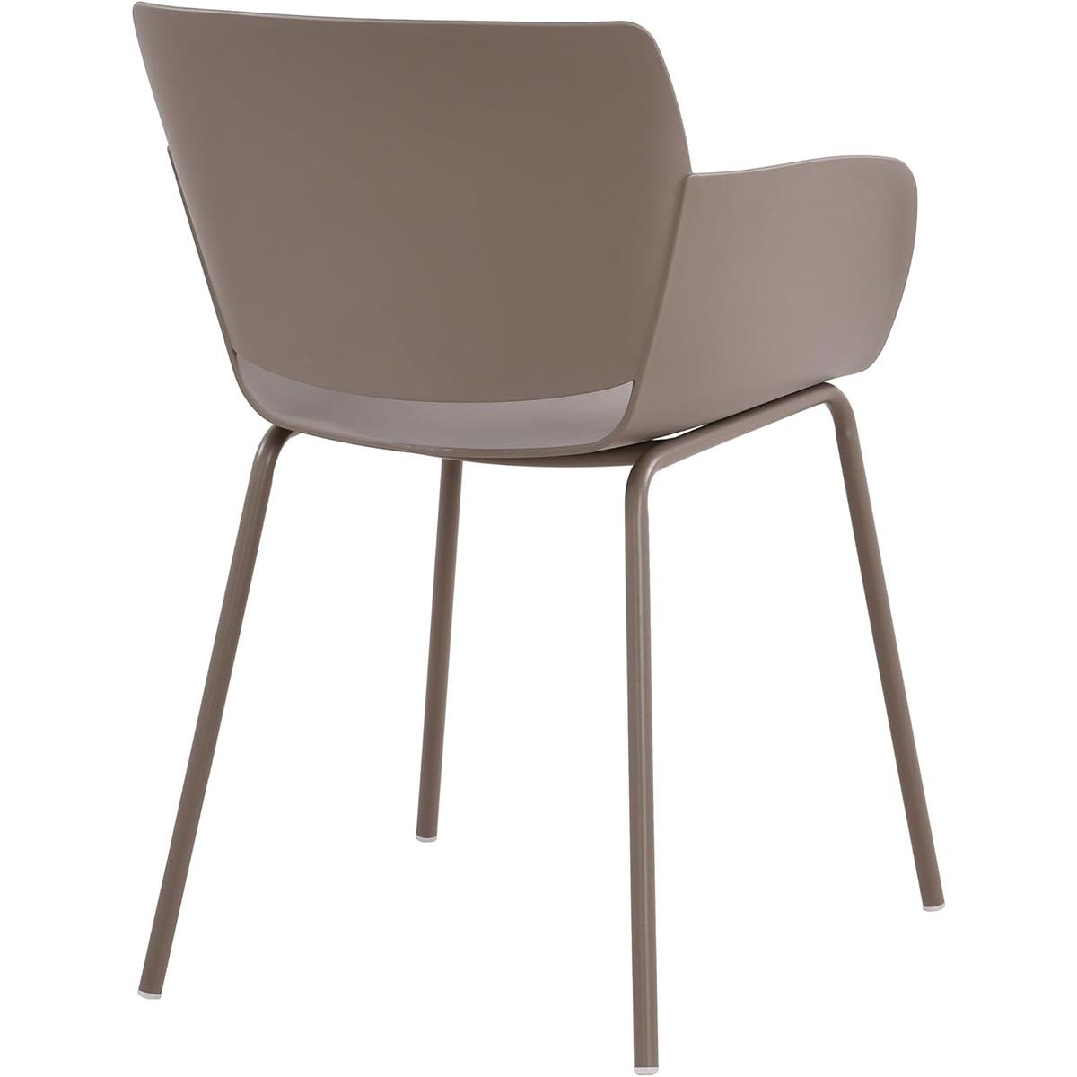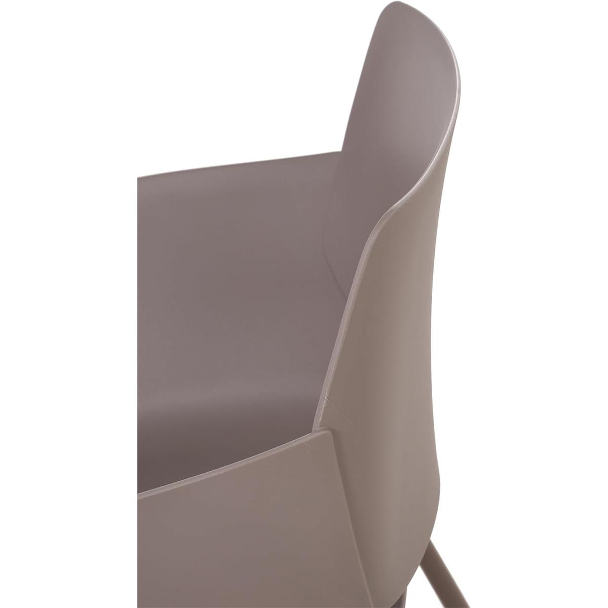 Die breite, umhüllende Sitzfläche ist aus Kunststoff gefertigt, einem soliden und langlebigen Material, das auch im Freien verwendet werden kann. Es ist sowohl widerstandsfähig als auch leicht zu reinigen, ein wichtiges Detail für den täglichen Gebrauch. Der Stuhl ist mit einer Rückenlehne und Armlehnen für bequemes Sitzen ausgestattet. Design und Zweckmäßigkeit gehen bei diesem Modell eine perfekte Verbindung ein.