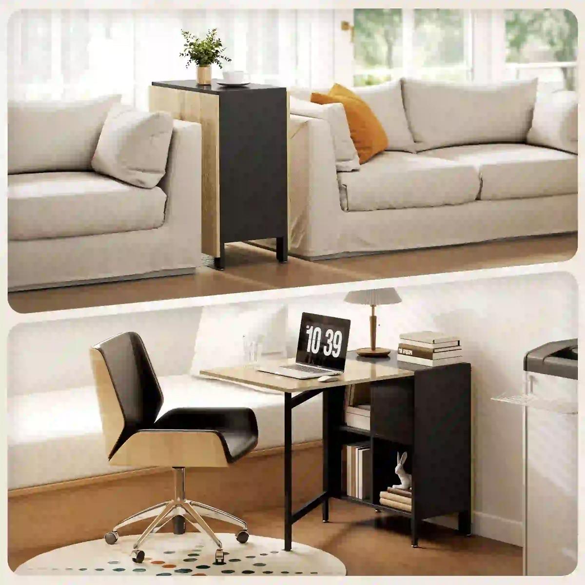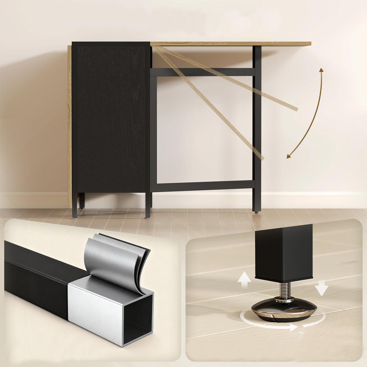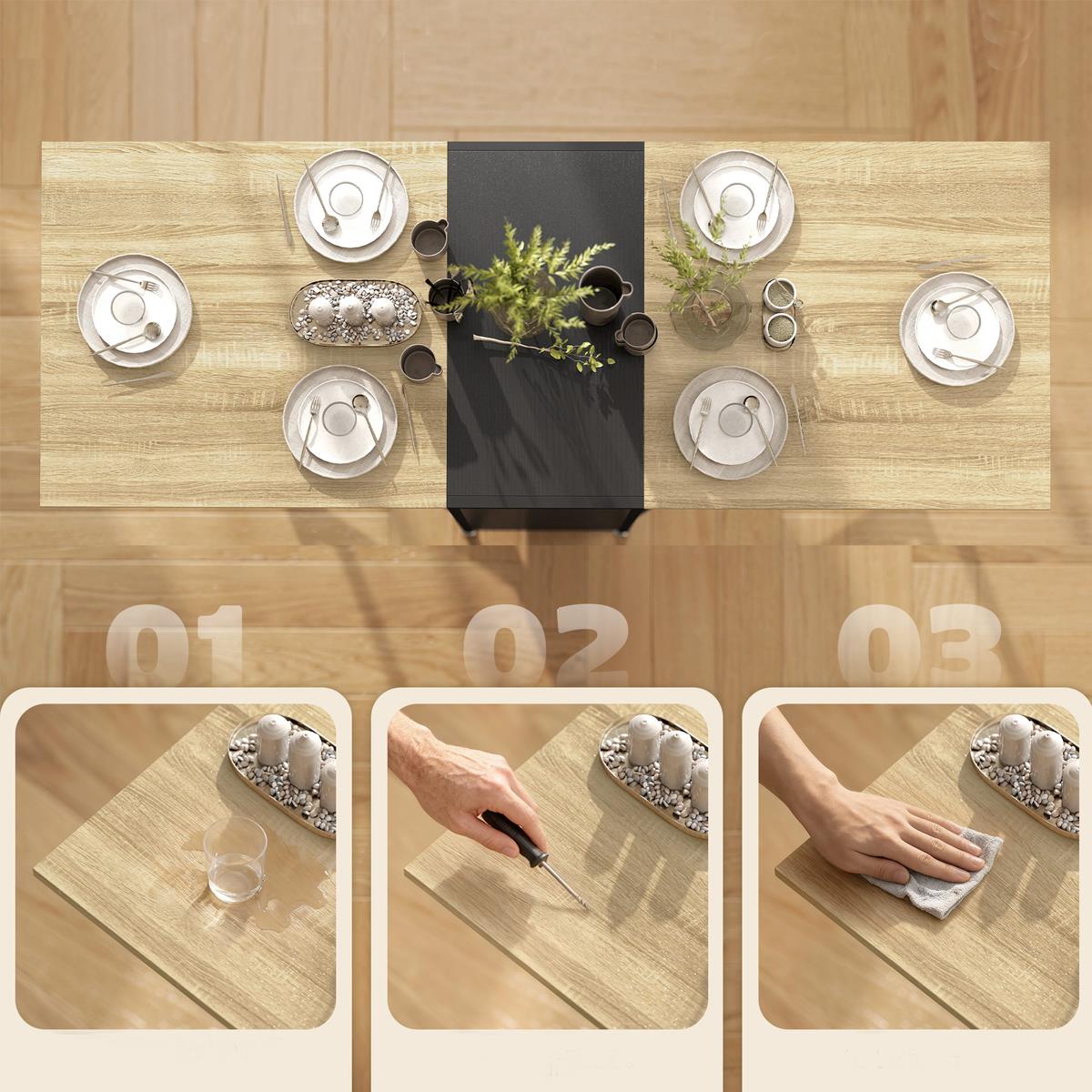 Der Tisch lässt sich auf einer Seite oder beiden Seiten zusammenklappen und kann drei verschiedene Formen annehmen. In der Mitte verfügt er zudem über 4 praktische, würfelförmige Fächer, in denen Akten oder Büroaccessoires verstaut werden können, sodass der Tisch auch als zusätzliches Aufbewahrungsmöbel genutzt werden kann. Die großzügige Auflagefläche zeichnet sich durch eine hochwertige Naturholzoptik aus, es werden Ästhetik und maximale Funktionalität vereint. Die glatte Oberfläche garantiert einfache Pflege und ist widerstandsfähig für den täglichen Gebrauch ist.