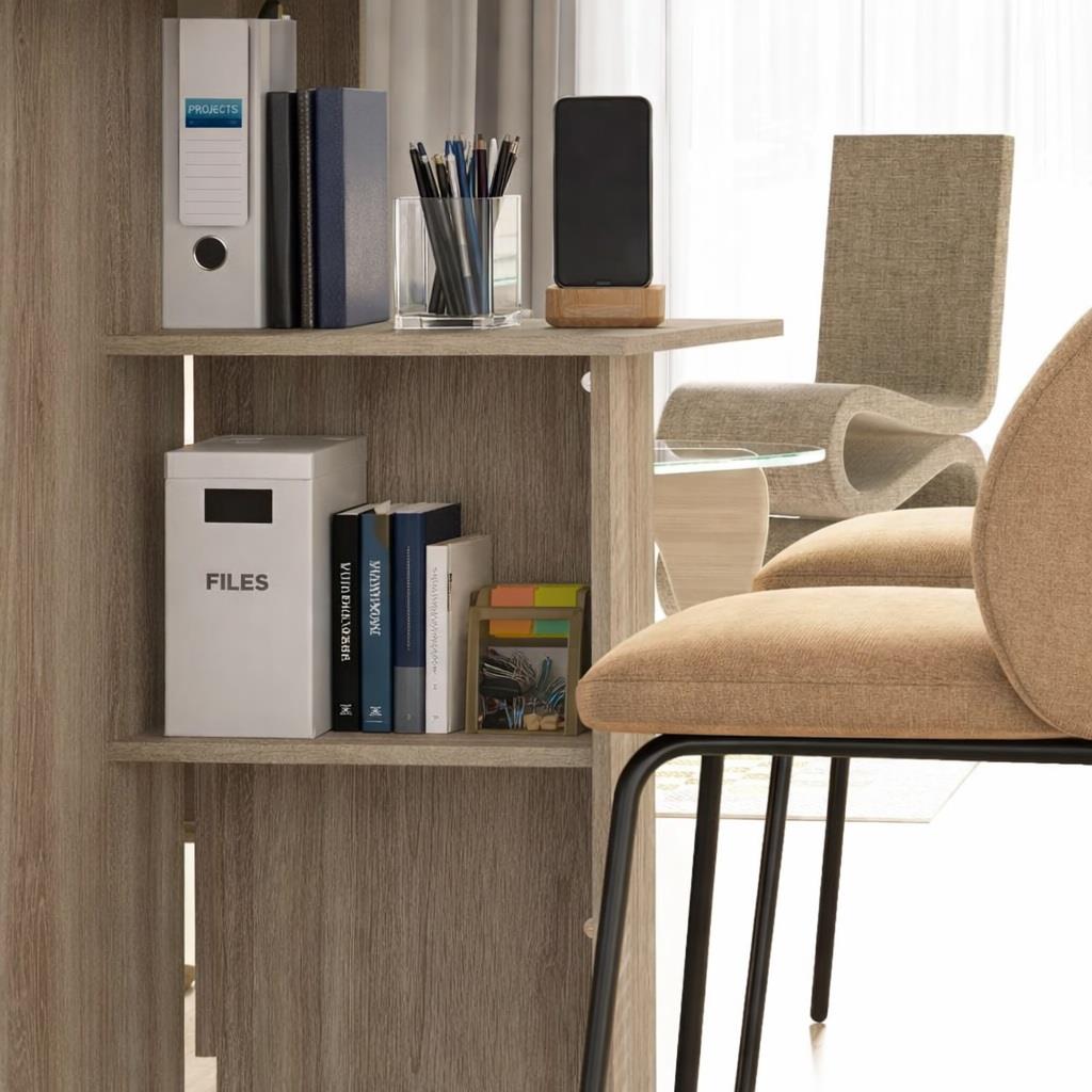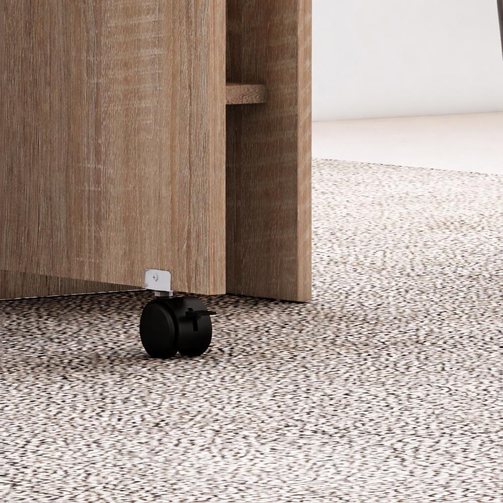 Neben seiner flexiblen Bauweise überzeugt der Tisch auch durch praktische Details. Zwei zentrale Ablagefächer bieten zusätzlichen Stauraum für Unterlagen oder Zubehör. Für mehr Komfort und Stabilität ist das Modell außerdem mit zwei Rollen inklusive Feststellbremse ausgestattet, sodass es sich leicht bewegen und sicher fixieren lässt. Die Konstruktion aus hochwertigem Holz sorgt für Stabilität und Langlebigkeit, während das Design insgesamt leicht und zeitgemäß wirkt.
