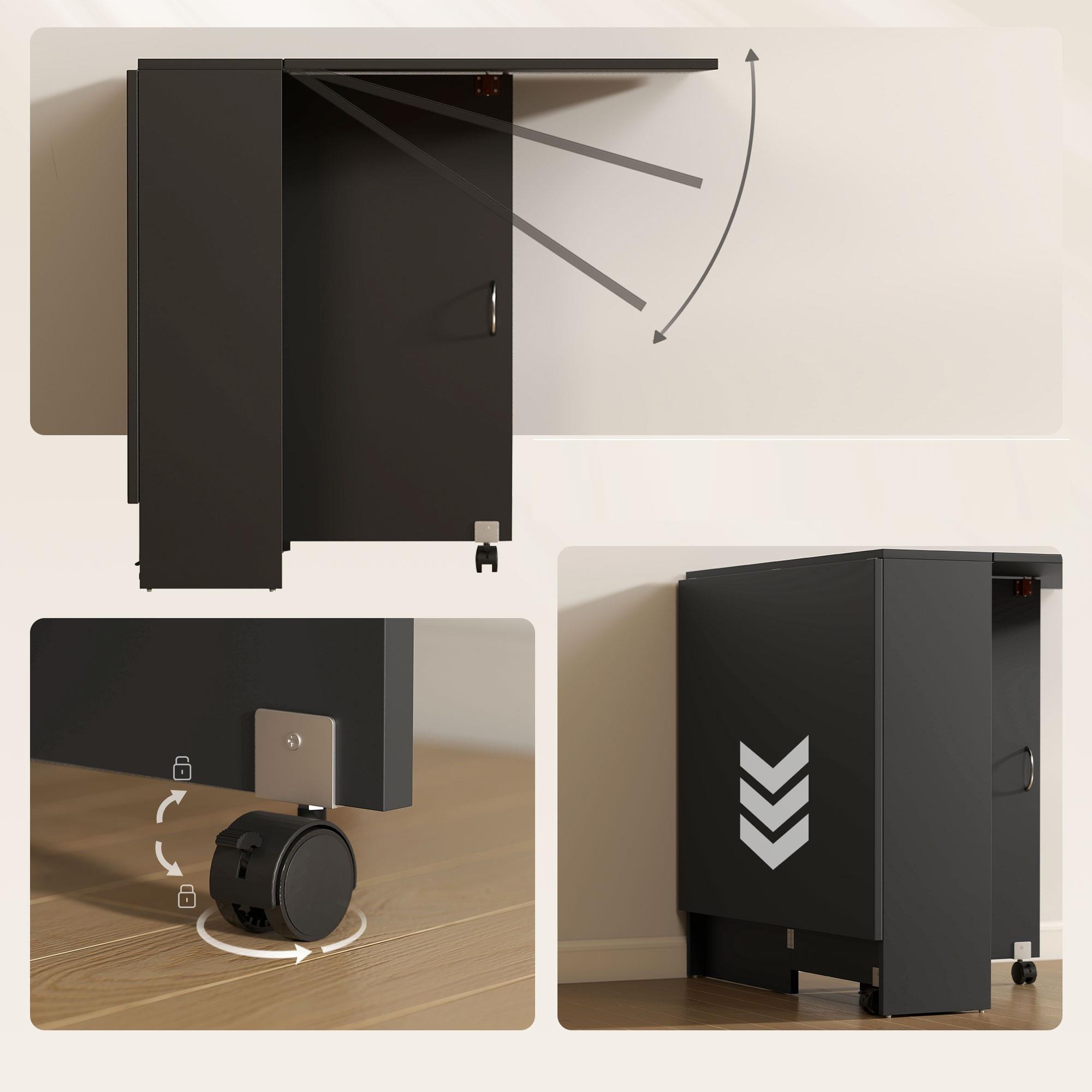 Neben seiner flexiblen Bauweise überzeugt der Tisch auch durch praktische Details. Zwei zentrale Ablagefächer bieten zusätzlichen Stauraum für Unterlagen oder Zubehör. Für mehr Komfort und Stabilität ist das Modell außerdem mit zwei Rollen inklusive Feststellbremse ausgestattet, sodass es sich leicht bewegen und sicher fixieren lässt. Die Konstruktion aus hochwertigem Holz sorgt für Stabilität und Langlebigkeit, während das Design insgesamt leicht und zeitgemäß wirkt.