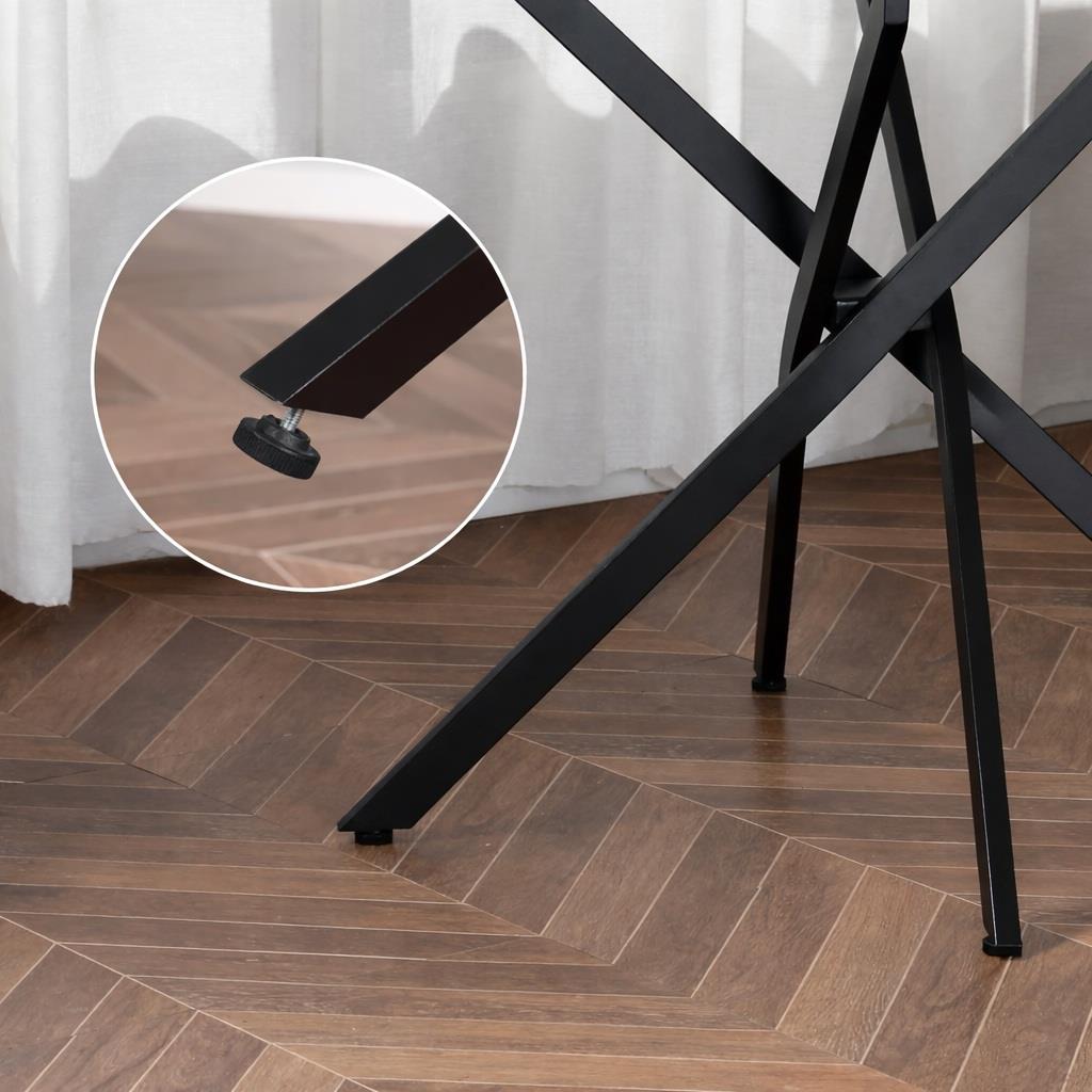 Die gekreuzten Tischbeine bestehen aus schwarzem Metall und sorgen nicht nur für ein unverwechselbares Designelement, sondern gewährleisten auch hervorragende Stabilität. Diese solide Konstruktion ist darauf ausgelegt, die Tischplatte ausgewogen zu tragen und bietet Zuverlässigkeit bei jeder Nutzung.