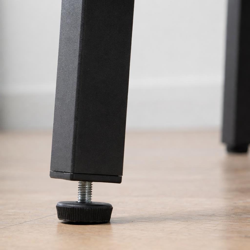 Die robuste Konstruktion aus beschichteter Spanplatte und stabilen, schwarz lackierten Stahlbeinen garantiert eine hohe Belastbarkeit und Langlebigkeit im täglichen Einsatz. Zusätzlich sorgen rutschfeste Fußpads für sicheren Stand und schützen empfindliche Böden zuverlässig vor Kratzern.