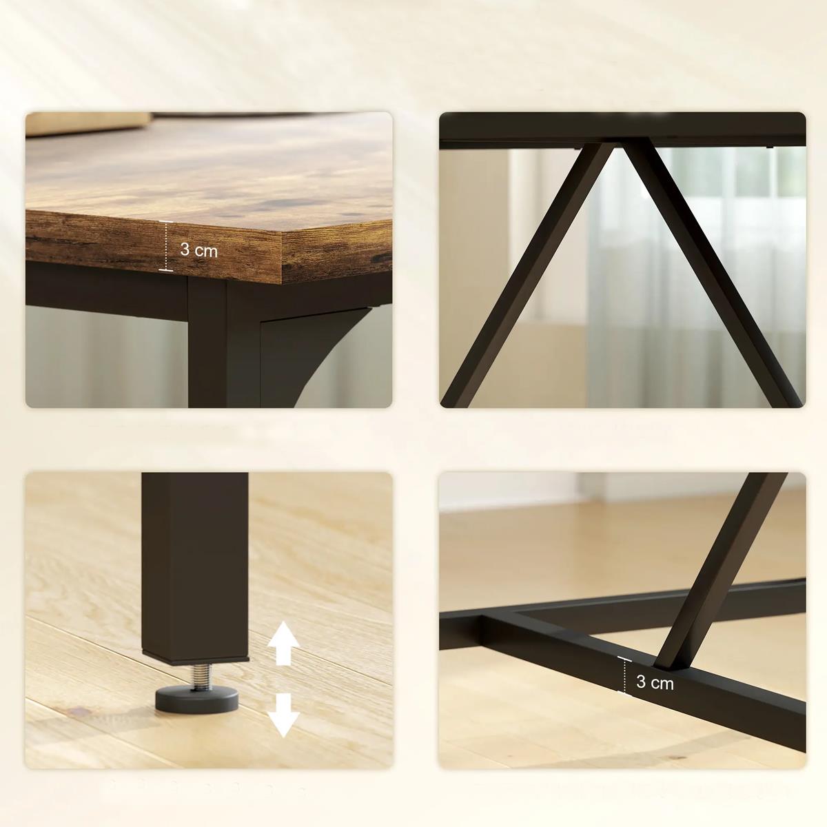 Die Tischbeine verfügen über verstellbare Füße, sodass der Tisch auch auf unebenen Flächen sicher steht. Für maximale Sicherheit sorgt ein V-förmiges Metallprofil am Gestell, das die Stabilität des Tisches zusätzlich verstärkt.