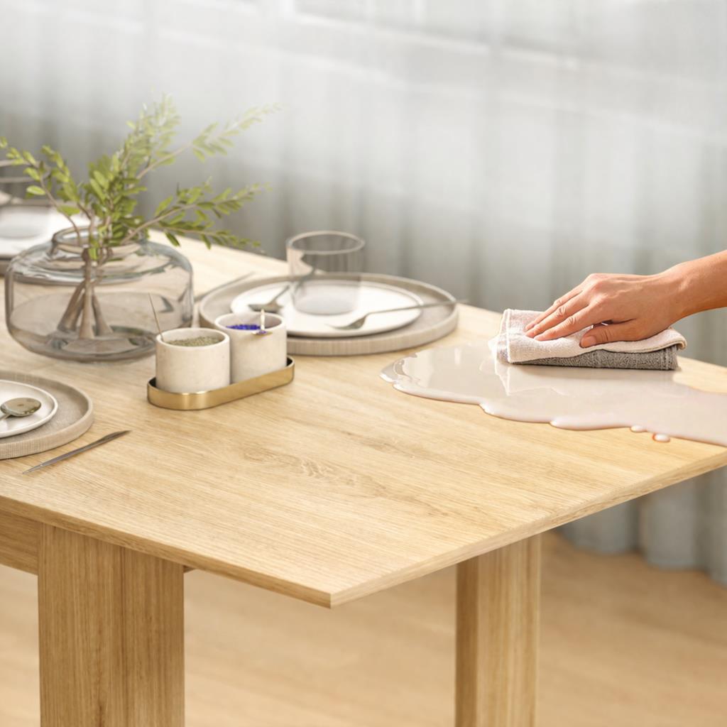 Daher ist der Tisch ideal für verschiedene Räume und den täglichen Gebrauch. Das MDF-Holz ist so behandelt, dass sie die Oberfläche leicht reinigen und pflegen können. Ein feuchtes Tuch genügt, um den Tisch sauber zu halten und ihm sein neuwertiges Aussehen zu verleihen. Die Tischbeine sind mit Schutzkappen versehen, um Ihren Boden vor Beschädigungen und Kratzern zu schützen und gleichzeitig die Stabilität und Standhaftigkeit zu erhöhen.