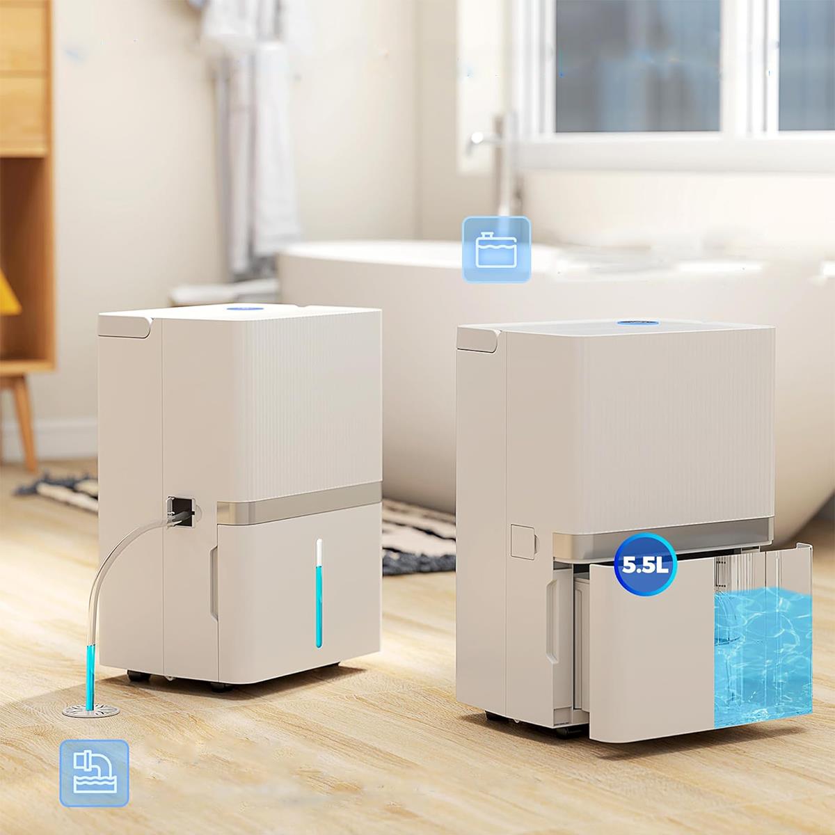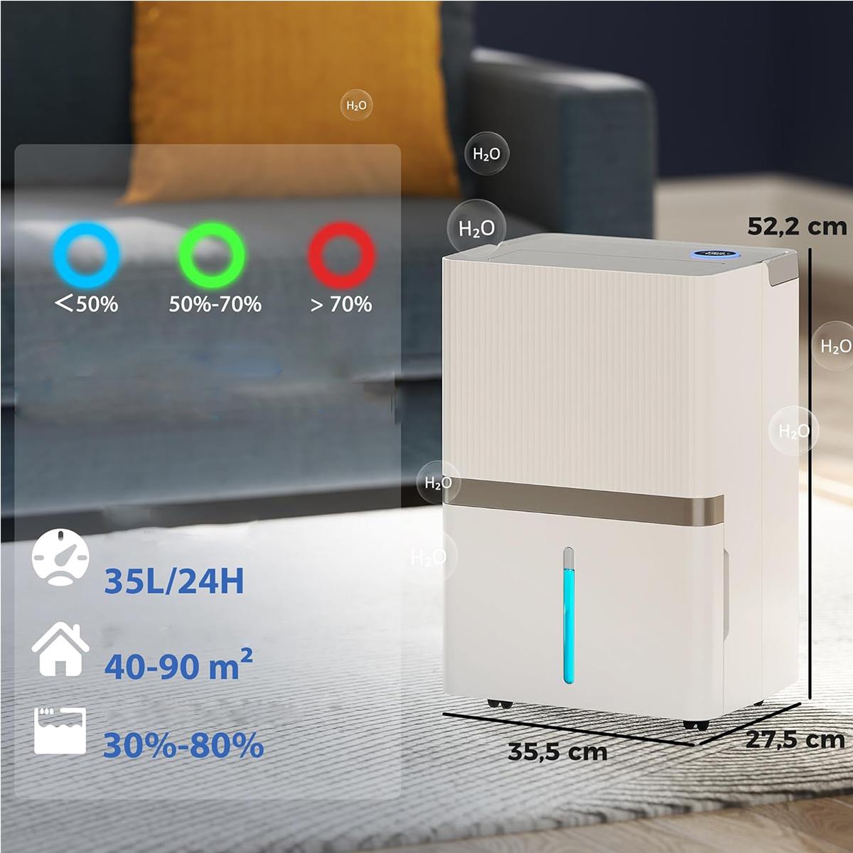 Dieser Luftentfeuchter eignet sich für große Flächen zwischen 40 und 90 m², verfügt über einen 5,5-Liter-Tank und entfernt bis zu 35 Liter Wasser pro Tag. Er ist mit einem herausnehmbaren Filter ausgestattet und kann dank seiner Leistung bis zu 350 m³/h Luft umwälzen, was eine schnelle Senkung der Luftfeuchtigkeit im Raum gewährleistet.